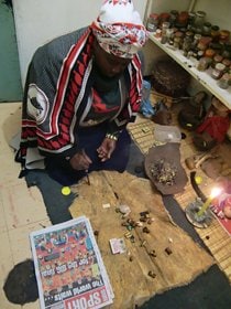 まず、50ランド(600円)のお布施を差し出す。彼女は厳かにキャンドルに火を灯し、何かが入った袋を両手で揉むようにしながら、何事か唱え始めた。ブルースによると、ズールー語で「教えて下さい、教えて下さい、どちらが勝てますでしょうか」などとつぶやいていたそうだ。