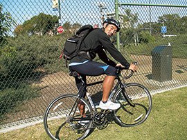 最初のうちは、坂道を1分間全力で登って、2分間休んでまた登るというインターバルトレーニングが中心でした。でも、最近は自転車に乗ること自体が楽しくなってきて、だいたい週に1回、サイクリングロードを5~6時間走ってます。そのときも1分ダッシュして2分流すというサイクルで走っているので、奇妙なやつだと思われてるでしょうけど(笑)。それにしても、この道はずっと海が見渡せて気持ちがいいんです。雨もほとんど降らないし、自転車乗りにとってサンディエゴは最高の土地だと思いますよ。