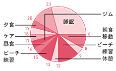 ふだんは朝9時からビーチで練習開始です。12時まで約3時間、ボールを使った練習をこなして、その後に砂浜を走り込みます。7kgくらいあるジャケットを着てコートのまわりを何周もしながら、プッシュアップ(腕立て伏せ)、5kgのボールを持っての腹筋、それにネットでのブロックジャンプをとり入れたサーキットトレーニングをやって。何十周と走った後に、次は瞬発力を高めるためのダッシュトレ。笛が鳴ったら寝て、次に鳴ったら起き上がってダッシュ、また笛が鳴るとストップしてジョグ……。その繰り返しを30分間ずっと続ける。あとは、ジムでのウエイトトレーニングがあって、ひと通りの練習が終わると夕方の5時くらいになっています。