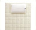 マットレスのカバーは片面がメッシュ、もう一方はキルト。シングル/幅100×長さ195×厚さ5cm。6万6150円(税込)。同素材の枕(幅60×長さ40×厚さ6~10cm)1万4490円(税込)。