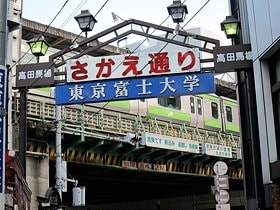 ところが、そのさかえ通りを自転車で駅側に行くと、うわ、違う。もはやここは早大生たちだけのものじゃない。「さかえ通り」の看板の下に、青地に白で「東京富士大学」と大書してある。そうか、さかえ通りの覇権はすでに、早稲田から東京富士に移ってしまったということか。何だかすごいな。恐るべし、東京富士大学。