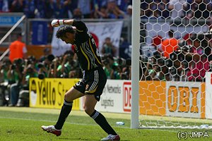 クロアチア戦の終盤が忘れられない。相手のシュートがワクを逸れると、川口能活は一刻も早く試合を再開しようとした。