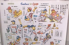 3連戦で用紙1枚。各試合の名場面、活躍した選手の躍動が生き生きと描かれたそれらは、今季色を得たことで、一昨年とも昨年とも違う、ヤクルト移籍3年目にして完成を見たかのような圧倒的な迫力。ながさわが生活のすべてを犠牲にして打ち込んだ怪作も、ついにここまで来たかと得も言われぬ感動が押し寄せる。