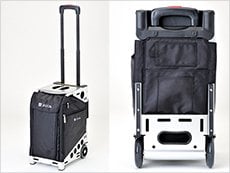 【写真上】 4インチのポリウレタンホイールを採用。歩道の段差はもちろん、階段の登りも楽々クリアする。【写真下】 軽くて丈夫なアルミフレームには、上部、後部、下部に取っ手が装備。飛行機やクルマのラゲッジスペースへの出し入れが容易だ。