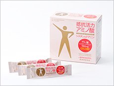 スティック1本に免疫力をアップさせるアミノ酸、シスチン700mg、テアニン280mgに加え、ビタミンCを50mg配合。1日1本を目安に水などと一緒に飲むだけで、激しい運動やストレス、加齢による免疫力低下に効果がある。スティック30本入り箱/5250円。