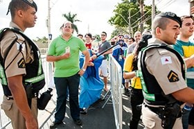 もちろんそのほとんどはブラジルのサッカーファンである。キックオフ3時間前頃からスタジアムの周りはにぎわい始め、ビールスタンドは大盛況。みんな生ビールや缶ビールを飲みながら、ほろ酔い気分でわいわいがやがやとやっている。メキシコ人サポーターや日本人サポーターが通り過ぎるたび、メッシコ! メッシコ! ジャーポン! ジャーポン! とエールを送り、励まし、からかい、記念写真を撮り合い、なんだかとても楽しそうだ(そりゃあまあ、むこうはすでに1次リーグを突破してるわけだから、楽しいんだろうけれど)。
