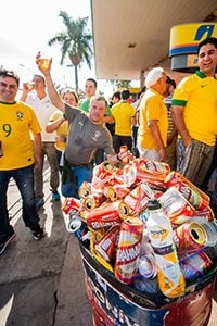 4日前の日本対メキシコ戦でも、たくさんのサポーターが試合前のスタジアム周辺で楽しんでいたが、この日の観客の出足はさらに早かった。もちろん気合いの入り方も全然違う。Brasil! Brasil! ブラジウ! ブラジウ! 誰かが叫び始めるとあっという間に大合唱となる。そして大合唱の後は、ビール、ビール、またビールだ。ブラジルの勝利にかんぱーい! ネイマールのゴールにかんぱーい! 目の前のゴミ籠はあっという間にビールの缶で埋め尽くされてゆく。