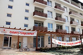 日本の宿泊棟は黒海に面した5階建ての建物で、全室を日本が使用。入り口には「Go! Go! Team Japan」の横断幕が掲げられ、選手にエールを送っている。女子アイスホッケーチームがベランダから顔を出し、ガッツポーズで応じてくれた。