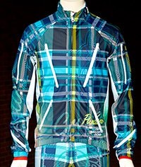 タータンチェックが美しい冬用長袖ジャージ。ライディング中の体温調節のために、ボディ全体に止水ファスナーを11個設けているのが特長だ(ボディ下の2個は前ポケット)。生地はUV効果の高いイタリア製で、伸縮性のある起毛生地をベースに背中や袖にメッシュ系生地を合わせるなど、凝った作りになっている。3万4814円(税抜)。