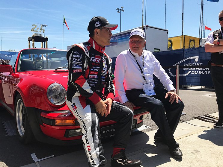 TOYOTAがハイブリッドカーで世界三大レースのうち最も過酷といわれる「ル・マン24時間耐久レース」に参戦したのは2012年。6年目となった今年、多忙を極めるトヨタ自動車のトップである豊田氏は決勝レース前日の6月16日に初めてのル・マン入りを果たした。サーキットにその姿を現すと、昨年激闘を繰り広げた“宿命のライバル”のポルシェ陣営にも温かく迎えられ、観戦客たちからもまた昨年のようなドラマチックなレース展開を期待されているのがよくわかるように「トヨータ!」と多くの声がかけられていた。