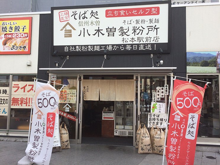 新宿駅から“スーパーあずさ”に揺られること2時間半。松本駅に降り立ち、原や斎藤のポスターに出迎えられ、小腹が空いたので駅前の立ち食い蕎麦屋『そば処 小木曽製粉所』に入った。