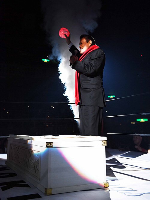 だが、棺の中に猪木はいなかった。猪木は『千の風になって』の替え歌を、「オレはそこにいません」とアカペラで歌いながら登場。リングインして棺に近づくとやおらそのフタを叩き割り、中から心臓とも魂ともとれる赤く光る球を取り出して、高々と掲げてみせる。