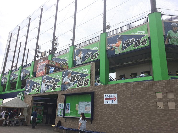 それがファイターズ鎌ケ谷スタジアムの第一印象だ。二軍球場と言えば、チケット売り場や売店も一軍本拠地とは雲泥の差……と勝手に思い込んでいたが、鎌ケ谷スタジアムの場合は各設備やデザイン面も含めしっかりした作りで、チームカラーで綺麗に塗装された球場の外壁には、過去に在籍した選手の巨大写真パネルが飾られている。