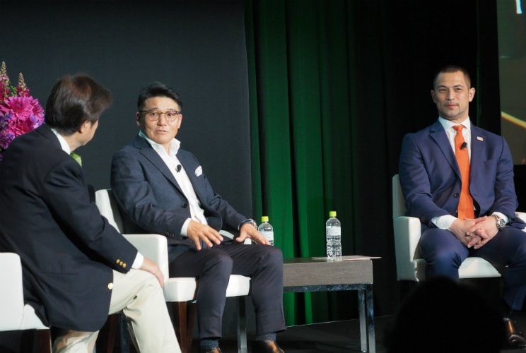 全米ゴルフ協会主催のシンポジウムで室伏広治と対談した丸山茂樹。シニアツアーでの復帰に向けて悪戦苦闘の日々を送っている。