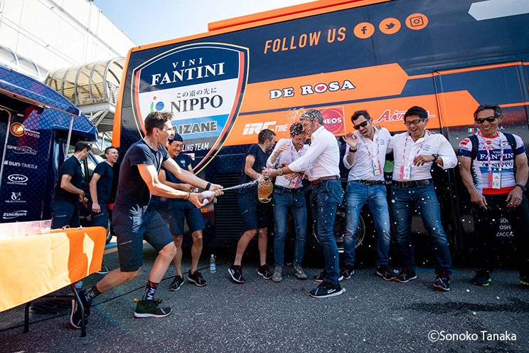 水谷監督はたまらず自宅のフランスへ電話をかけ、状況を確認した。フランス人の妻からテレビの実況をリアルタイムで伝えてもらい、迫りくる世界のトップスプリンターたちから逃れ、NIPPOのチーマがそのまま1位でフィニッシュしたことを聞かされる。