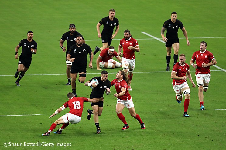 1枚目の写真と同じ、ニュージーランドの「TJ」ことペレナラを捉えた写真。だが、試合をどこから切り取るかという視点を変えると、写真の見せ方、捉え方がだいぶ違ってくる。客席に移動すると視界が一気に広がり、ラグビーは1人の選手で成り立っていないことが伝わるだろう。
