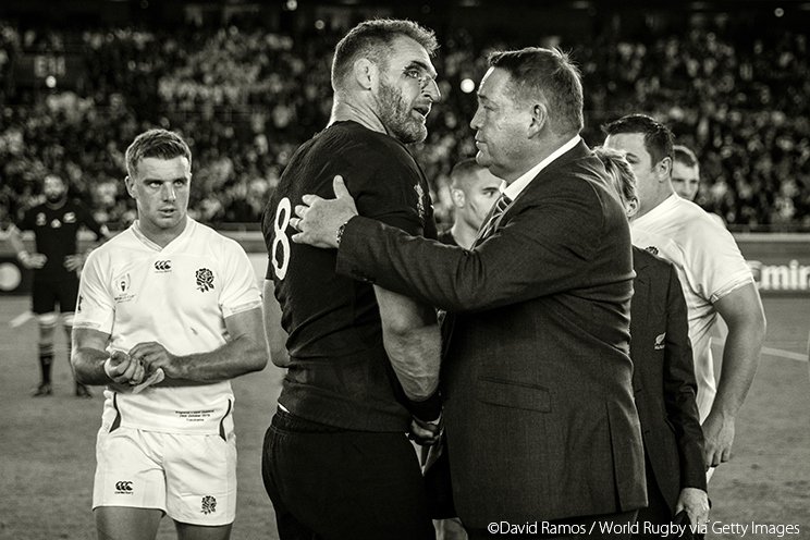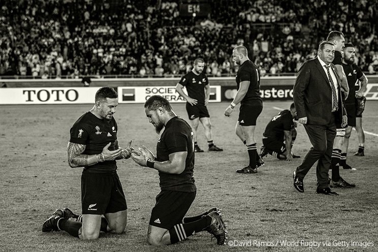 偉大なオールブラックスのキャプテンである、キーラン・リードが鼻から流血をしていることが、この試合が激闘であったことを物語っている。今大会で代表を退くキャプテンはすべてをフィールドで捧げたのだ。この写真では、ニュージーランドのヘッドコーチであるスティーブ・ハンセンが彼を慰めている。