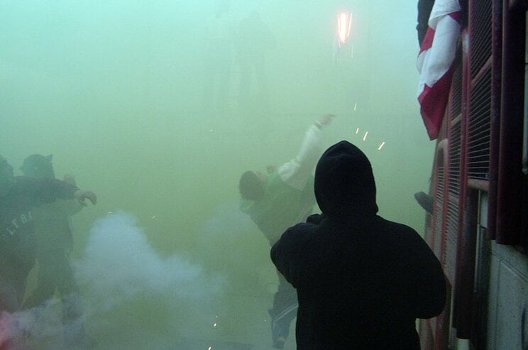 大量の煙と煤以外に色のない視界のなかで鼻と口を覆いながら、ウルトラスの仲間たちが血だらけになった着火係をさも馴れた動きで粛々と運び出していった。この程度で大騒ぎするんじゃねぇ、とでも言わんばかりに。