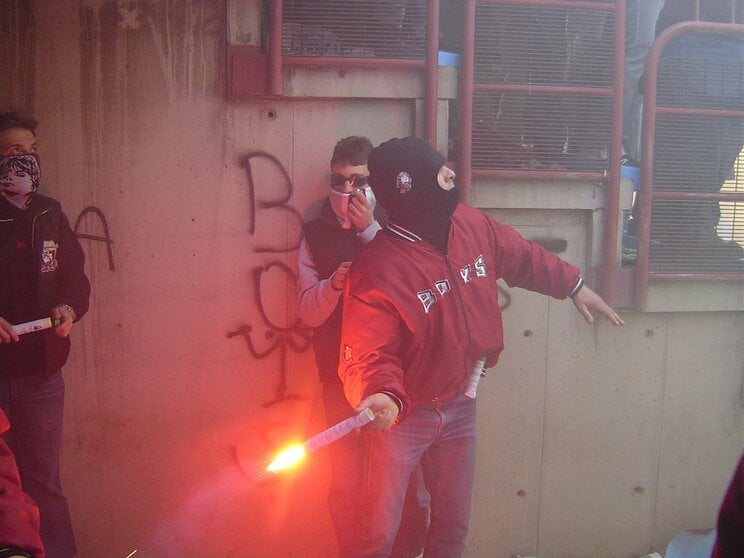 海峡ダービーのゴール裏での1コマ。サッカー場ではなく、戦場にしか見えない。