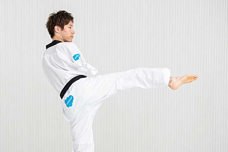 伊藤「蹴りも普通は膝を上げてこうステップで蹴りますよね。先生はテコンドーではないテコンドーをする方で、蹴り方もちょっと違う。脚を伸ばしたまま、こうやって力を入れずに上げる。普通は床を踏んで、それで蹴りのスピードを出すんですけど、僕らはスピードよりも初動を抑えることを意識しています」