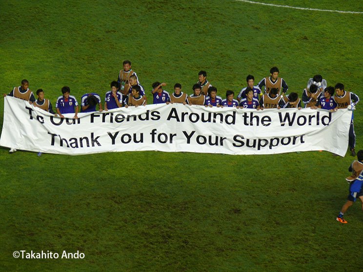 試合後、再びあの横断幕を持って場内を一周した。いつまでも響く割れんばかりの拍手と「ハポン」コールへの感謝を表すためでもあった。泣きながら手を振り、何度もスタンドを見回した。