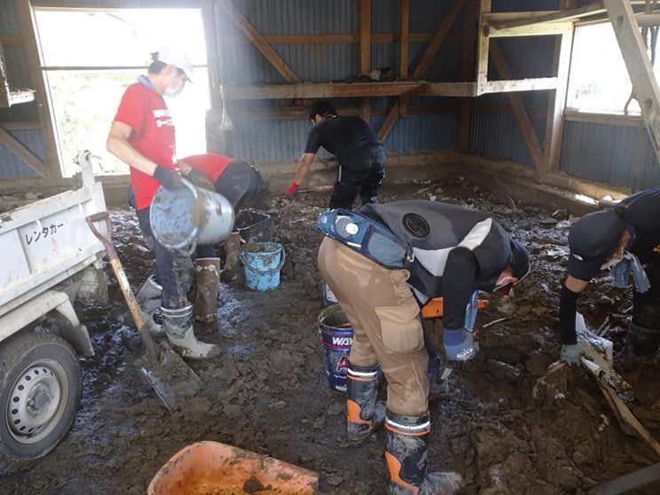 熊本豪雨で被害の大きかった八代市坂本地区で、ボランティア活動を続ける「チームドラゴン」の面々。