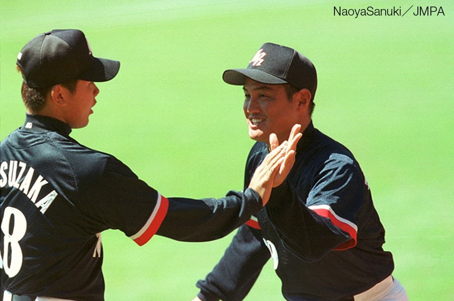 野球の3位決定戦でハイタッチする松坂大輔と杉浦正則。プロ参加が解禁となった中で松坂、中村紀洋や黒木知宏、アマにも杉内俊哉や阿部慎之助、赤星憲広らその後の名選手がメンバーにいたが4位に終わる。