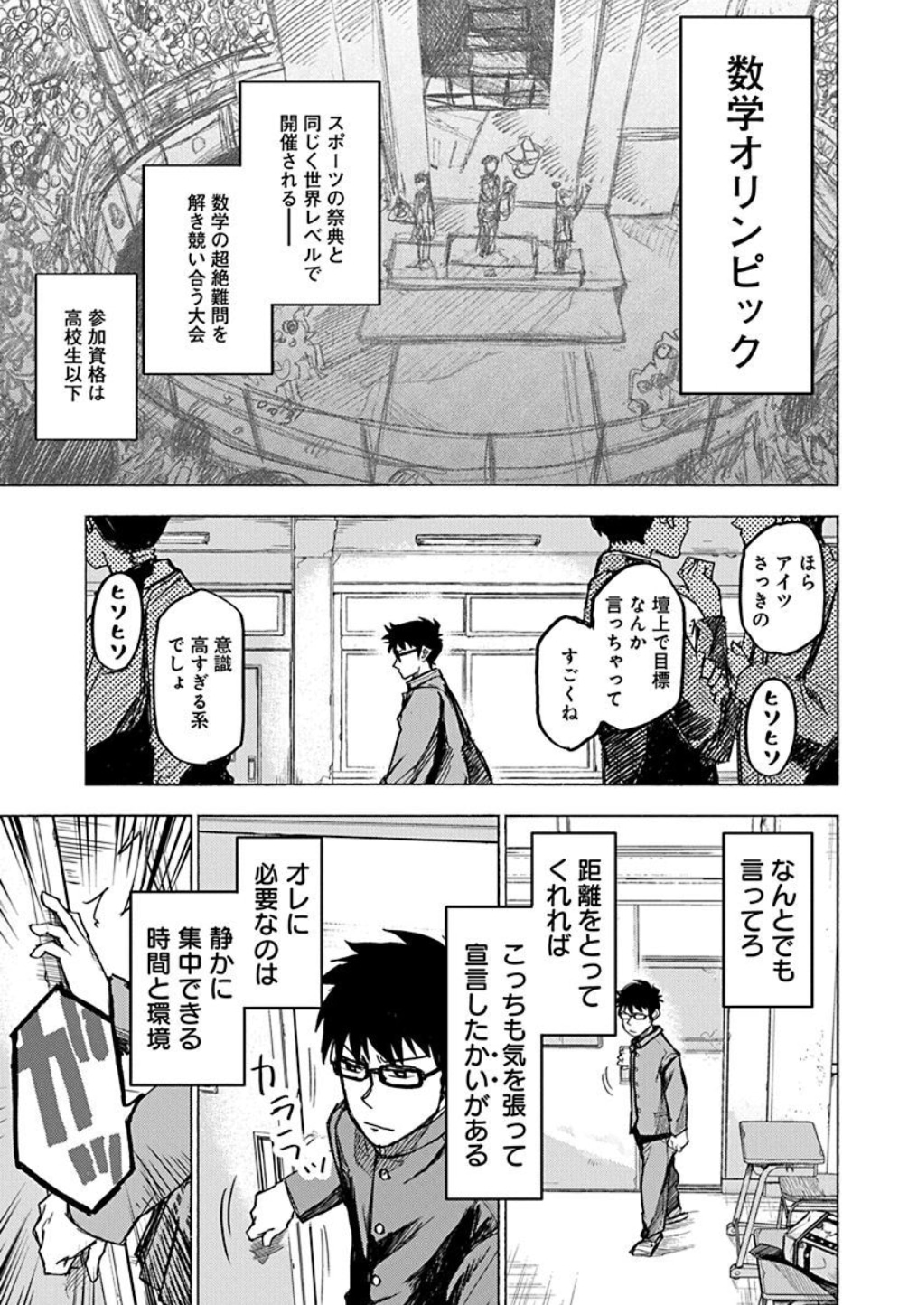 他人から無謀と言われる目標に、真摯に向き合い、探求し、開拓し、自らの世界を広げる数学が大好きな少年少女たち。努力する天才たちによる、純粋で熱い「数学オリンピックの世界」を描く“スポ根数学漫画”『数学ゴールデン』1巻より第1話をお届けする。