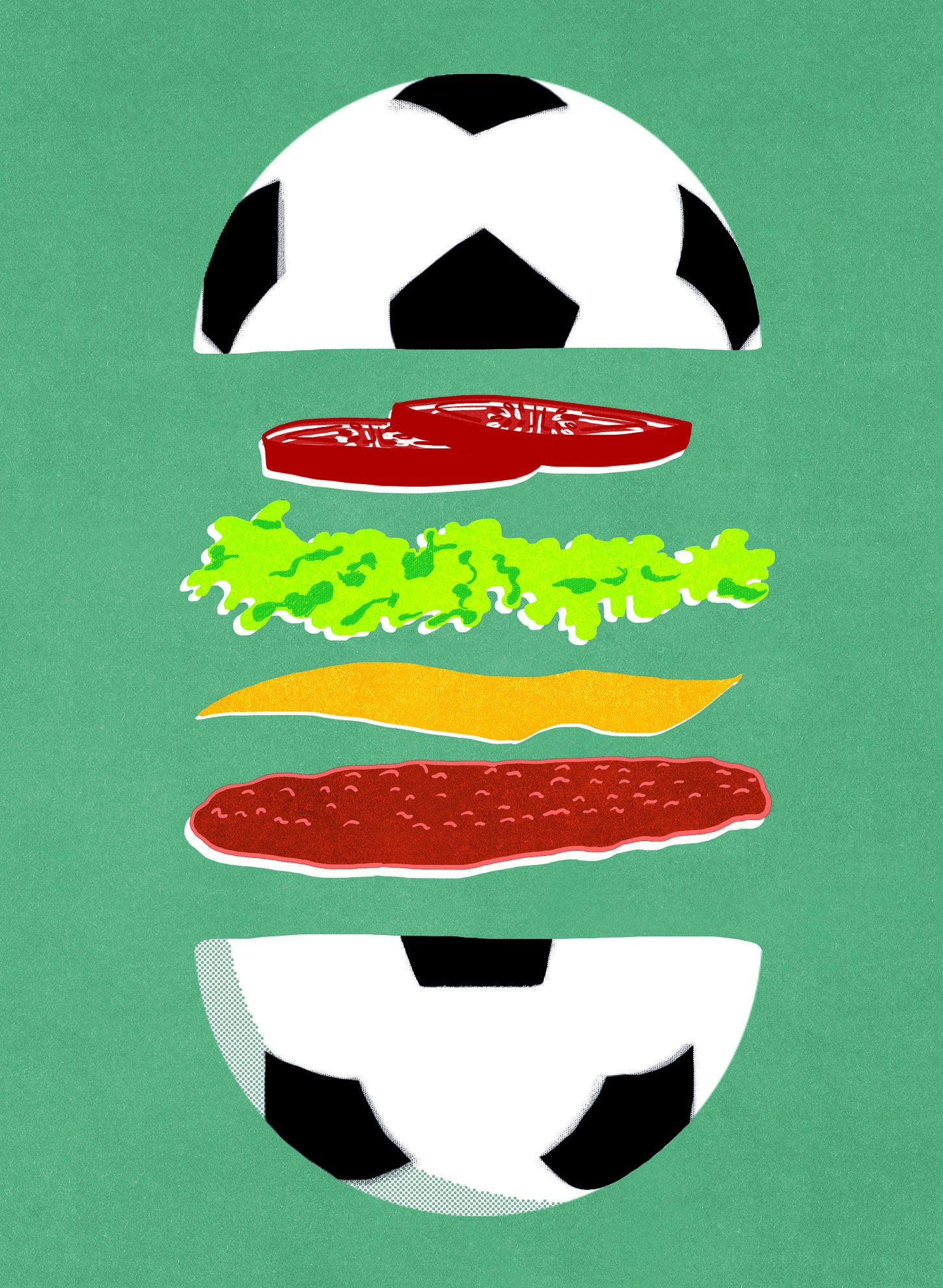 『フランス・フットボール』誌面は、フランスの雑誌らしくエスプリの効いたイラストの数々で「サッカー選手と食事」を表現した
