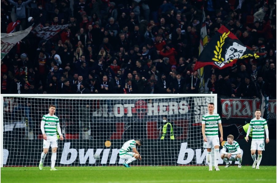 このゴールで、最終節を残してグループステージでの敗退が決まってしまい、腰を落としてしまうセルティックのメンバー達。