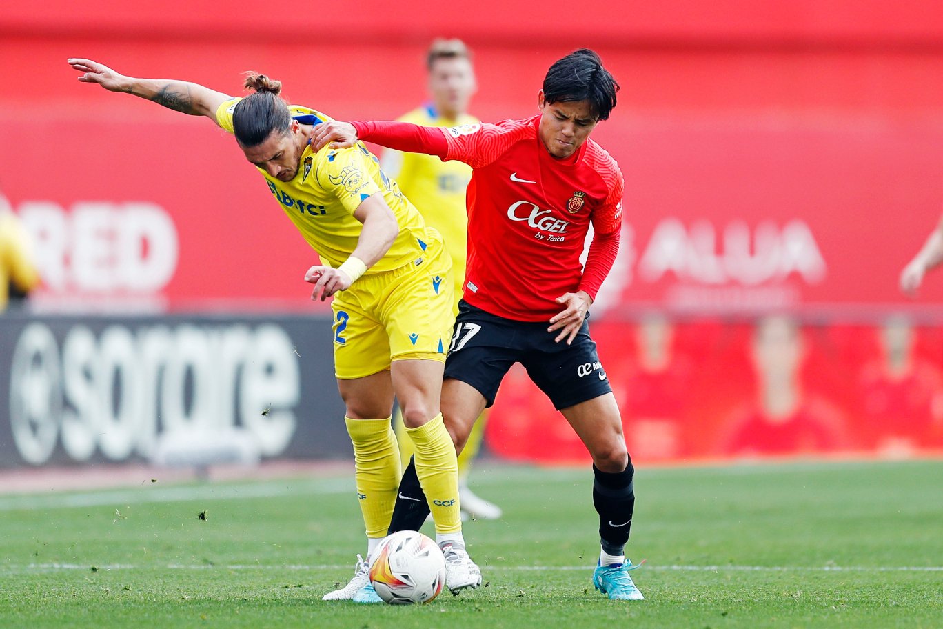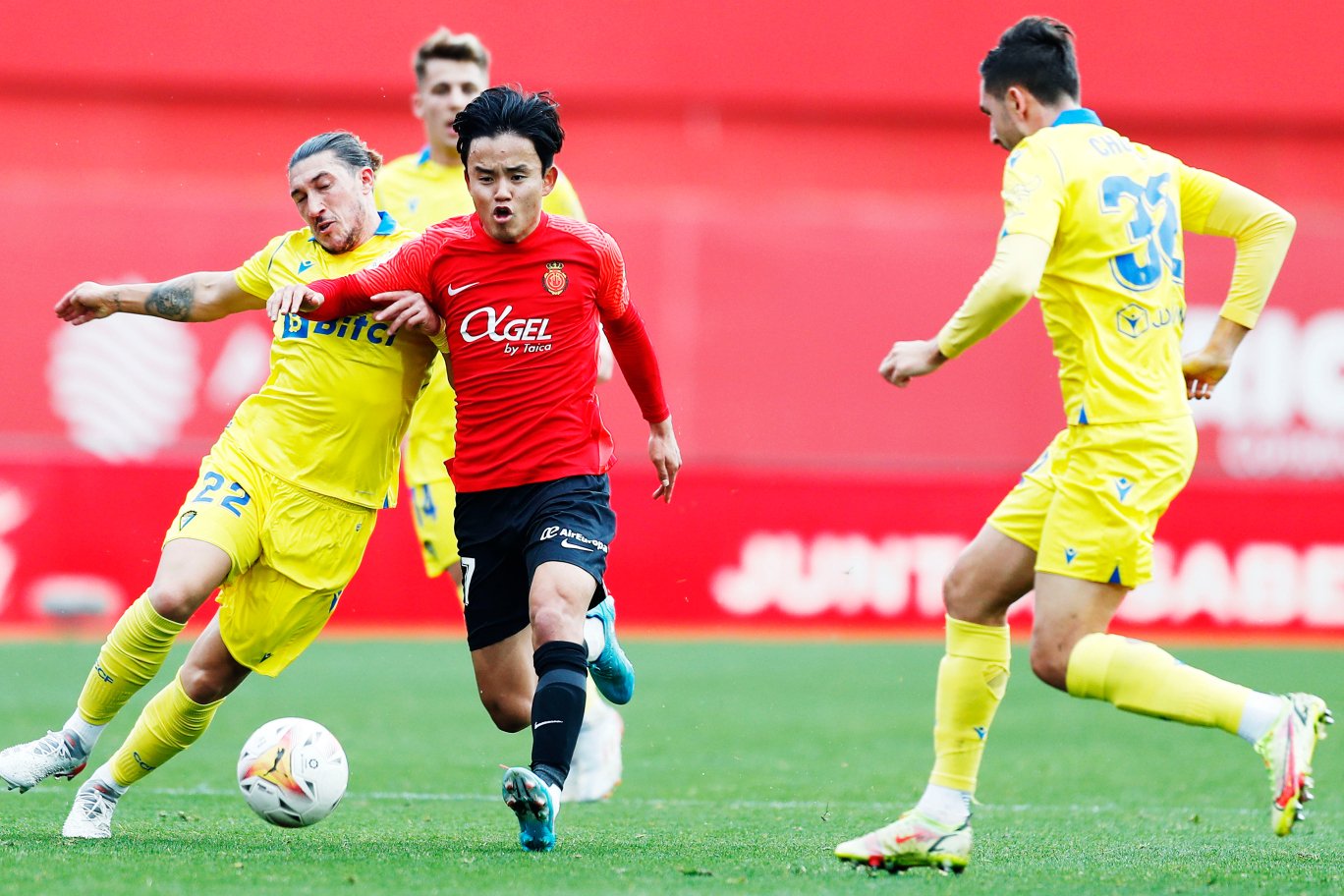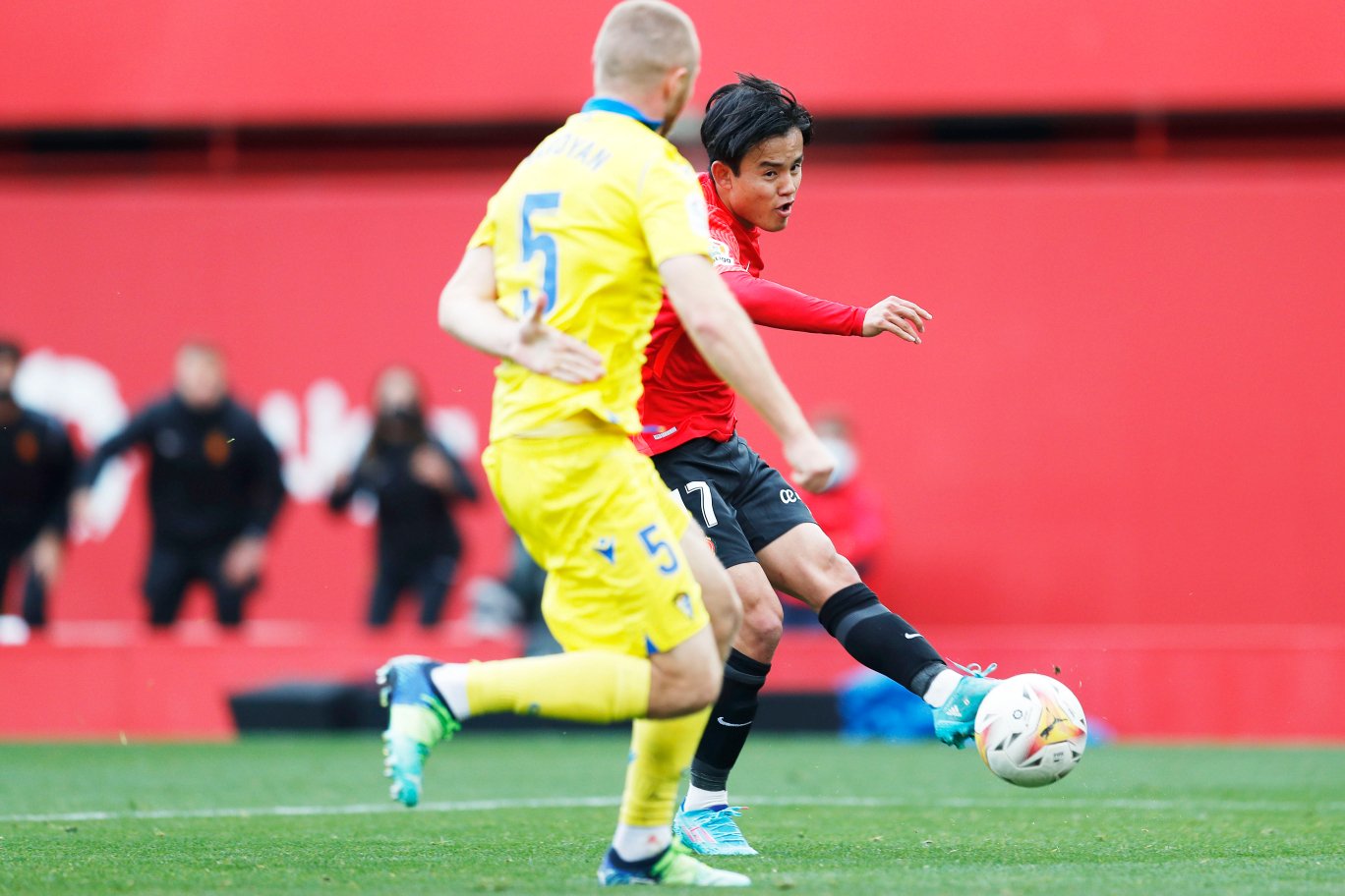 久保と対面したカディス左SBのパチャ・エスピーノとは何度も対決のシーンが撮れました。その中で、ルイス・デガラレッタのロングフィードを見事にコントロールすると、エスピーノも半歩ずらしてシュートまで持ち込みましたが、わずかにポストをかすめて外れてしまいます。