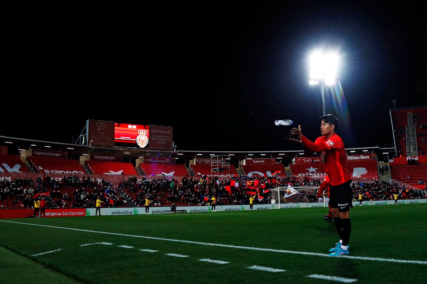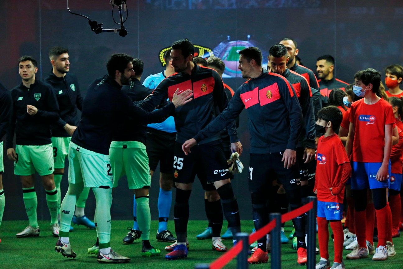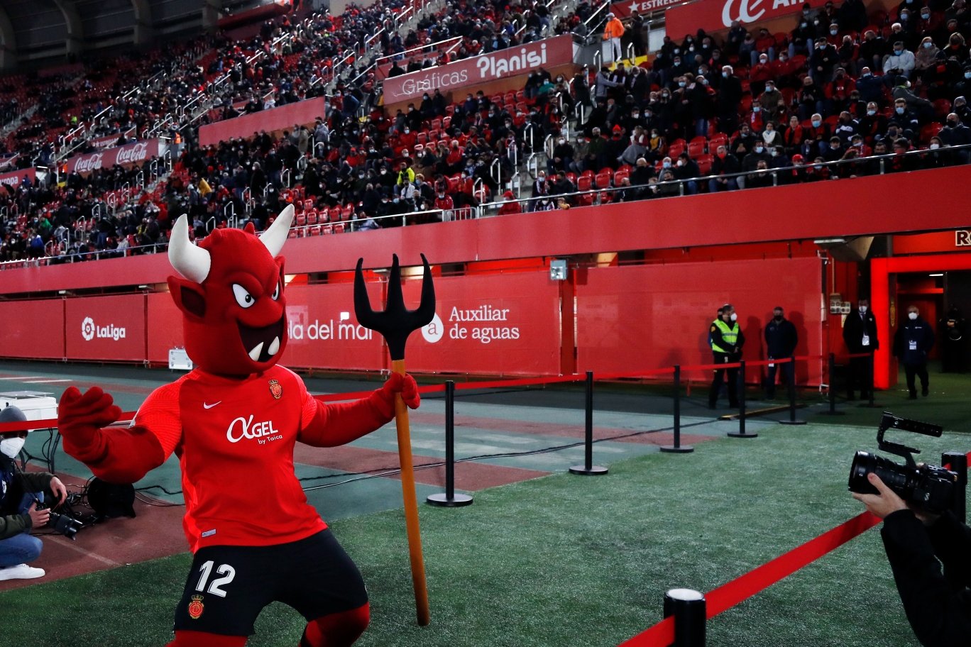 対するホームのマジョルカは、残留争いの直接のライバルだった前節のカディス戦での勝利の勢いのまま、同じメンバーでこの試合に臨みました。アップや、入場時の選手からは普段以上の何か特別なものは感じられず、入場ゲートで両チーム選手が健闘を誓いあいますが、それを見守るファンやマスコットなどからは、冷たい北風には負けない熱い勝利を期待する雰囲気が漂っていました。