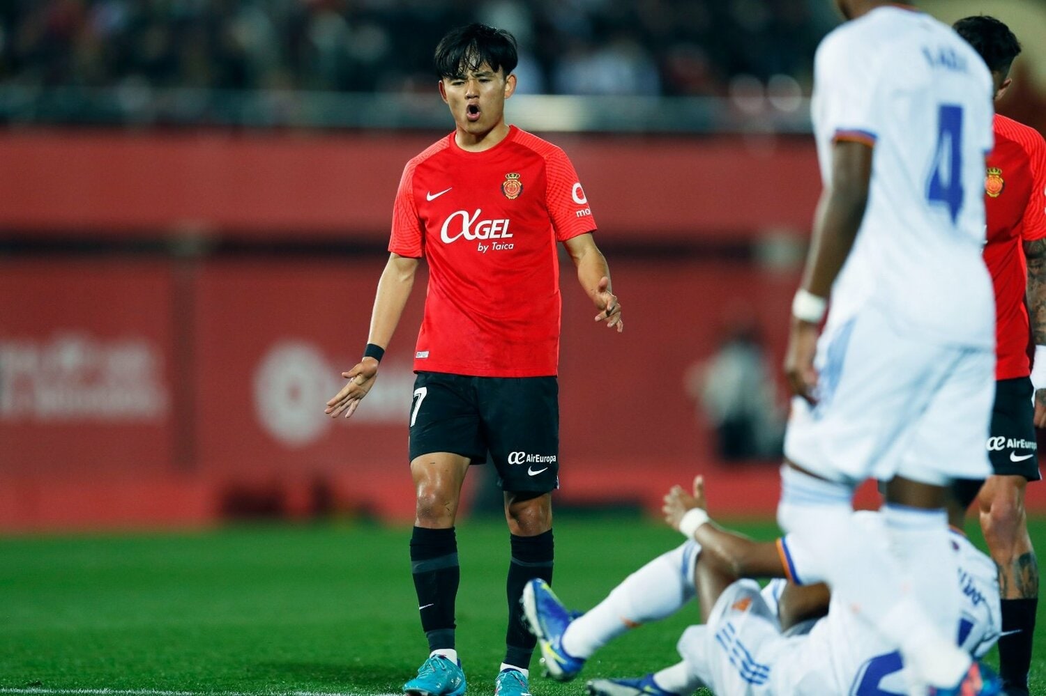 しかし、この頃になるとマドリーの攻勢を受けながらも、散発とはいえマジョルカもマドリーゴールを脅かすシーンが。先制点の期待からか、スタジアムから自然とマジョルカコールが響き始めました。そんな会場の雰囲気に呼応して両イレブンもヒートアップ。熱くなったアンヘルを久保がなだめるシーンもありました。