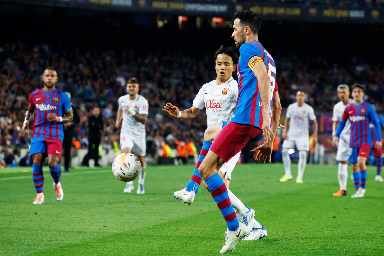 自陣深く、またはピッチ中央で身体をぶつけブスケッツからボールを奪うとする久保。 対するは世界的トップレベルのボランチ、身体に触れさせることすら許さない。互いの意地がぶつかり合う。