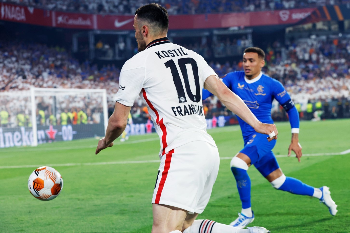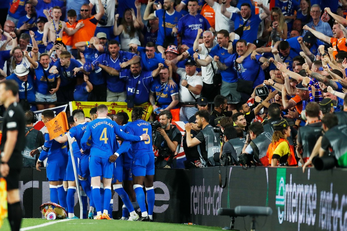レンジャーズの先制ゴールから12分後、コスティッチのクロスにボレが飛び込んでゴール。鎌田が叫びながらコスティッチに飛びつく。ファンの目の前で、同点ゴールを祝った。