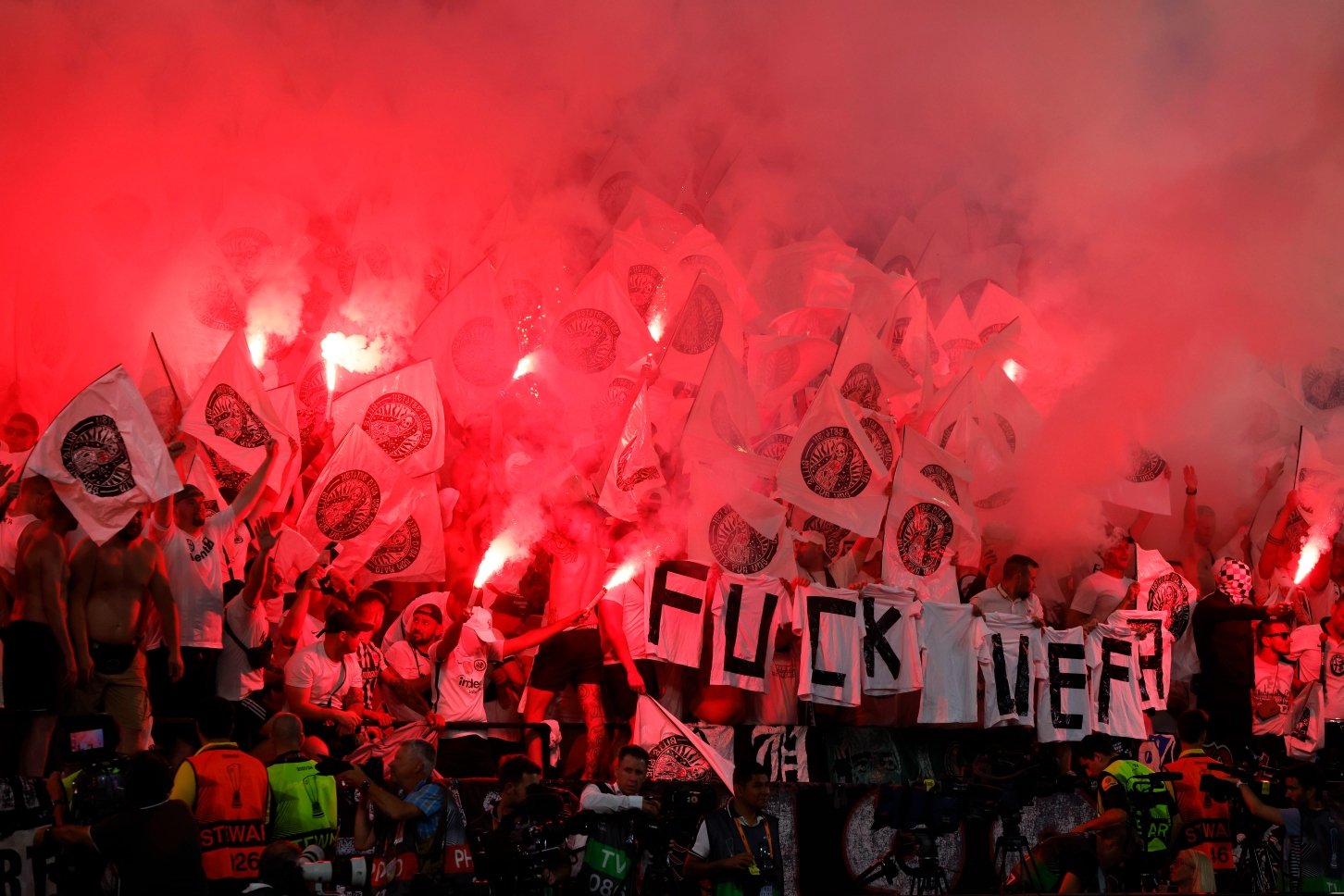 後半開始と同時に、フランクフルトサポーターが発煙筒を焚き、フランクフルトが攻めるゴールの辺りは煙に包まれ、一時は写真も撮れないほどだった。