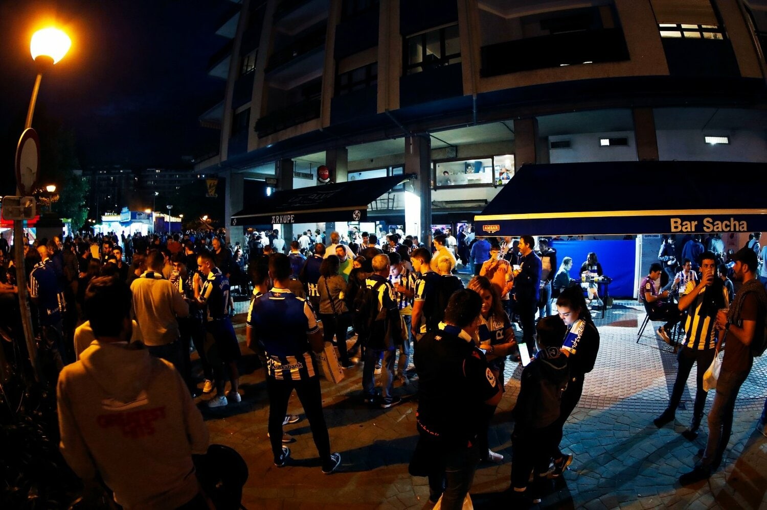 キックオフは21時。スペインとはいえ冬時間に切り替わるまでは20時前には日が落ちてしまう。スタジアム最寄の『Bar Sacha』に集まるソシエダサポーターを、夕日に代わって街灯がタングステン色に照らしていた。