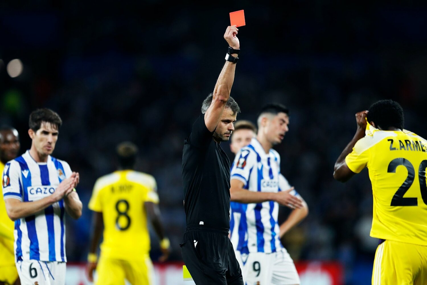 だが33分、ディエゴ・リコの突破をシェリフ20番ゾホウリが手で突き飛ばし、2枚目のイエローカードで退場に。ことの重大さに気づき落ち込む姿は悲壮感を漂わせたが、軽率なプレーだったか。