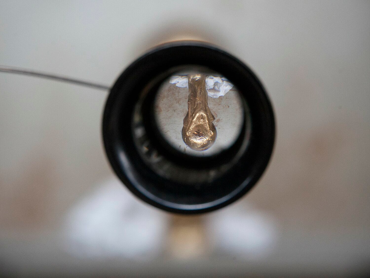 金メッキ加工が終わり、トロフィーは蒸留水で細心の注意をもって洗浄される。乾燥後は精密彫刻用ルーペで入念なチェック。