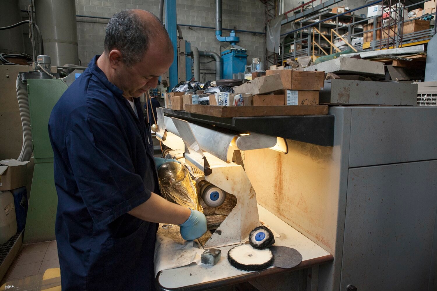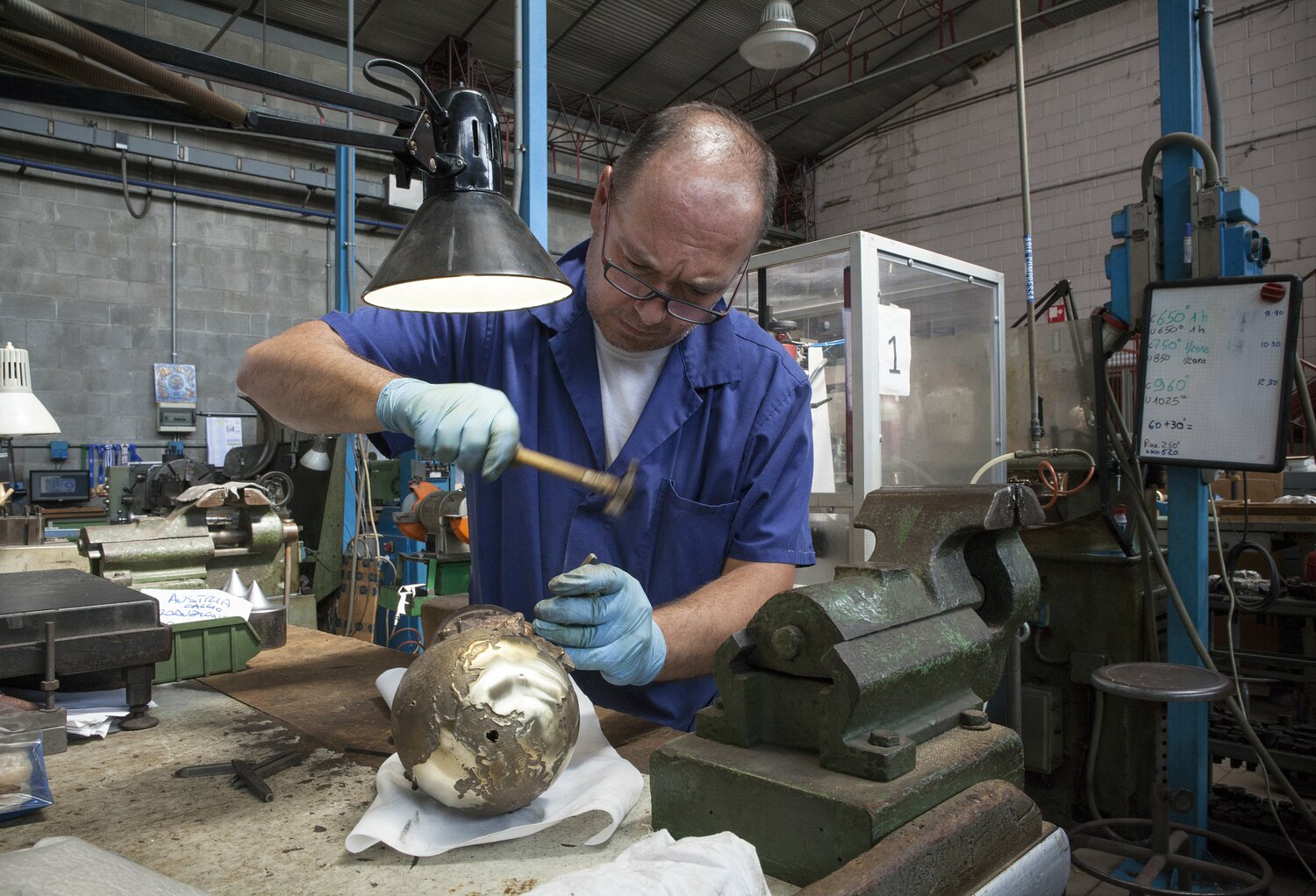 「ワールドカップの作り方」は、“荒削り”から始まる。真鍮で鋳造されたばかりのトロフィー本体から余分な金属片を電動リューターで削り落とす。