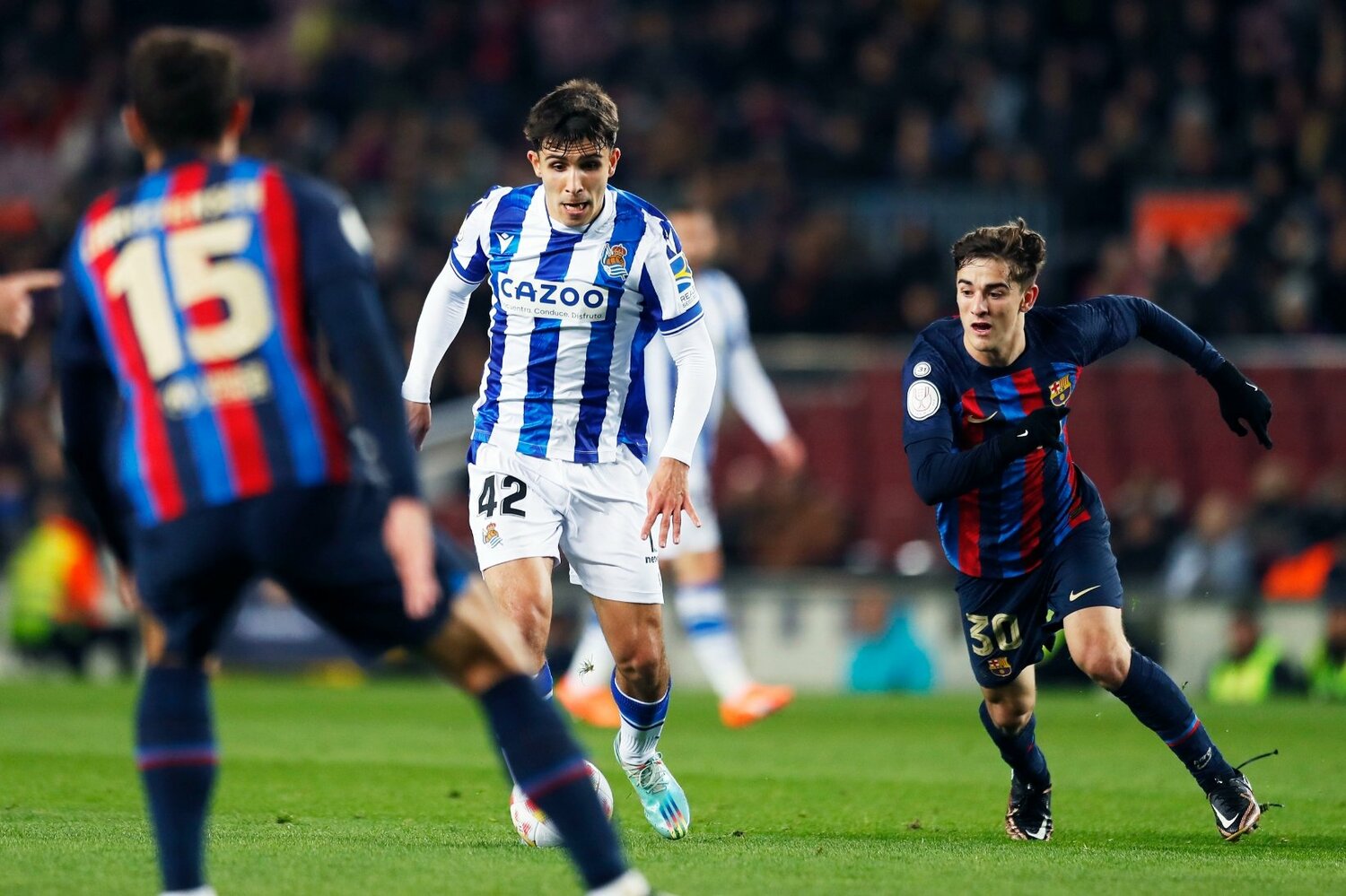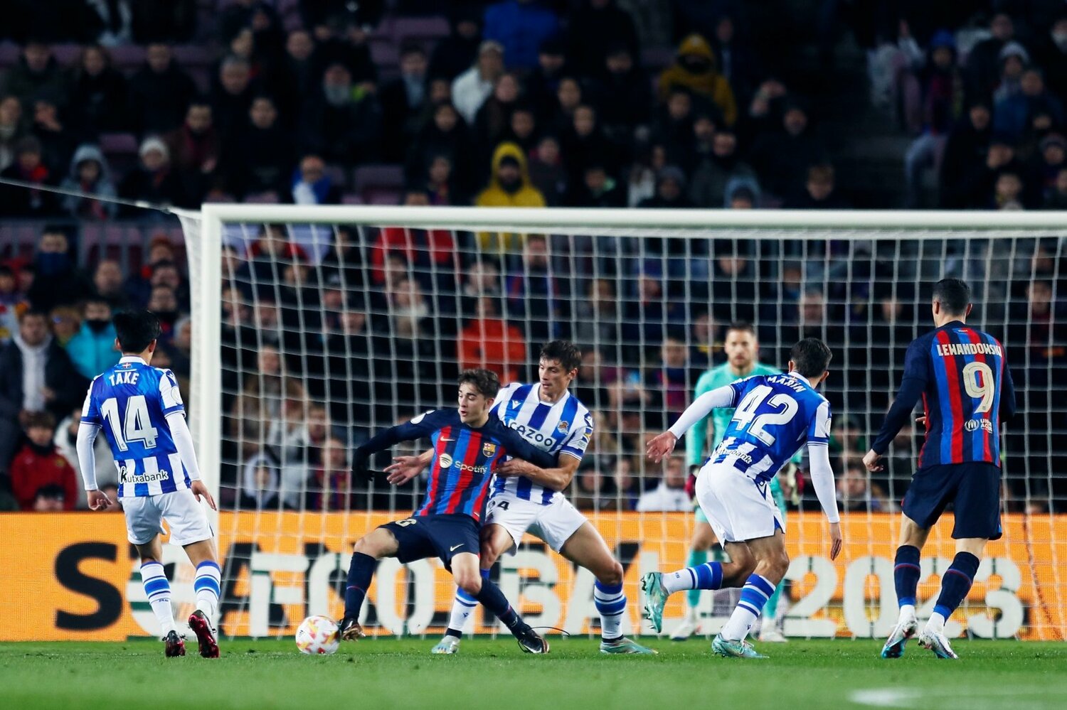 なんとか1人少ない中でもバルサの攻撃を凌ぎたいソシエダは、一層激しさを見せる。後半開始早々、セルロートとアラウホ、またアリツ・エルストンドとガビが揉めるシーンが見られた。その中では、久保とブスケッツの言い争いも。それを見ていたデンベレは笑顔を浮かべていた。