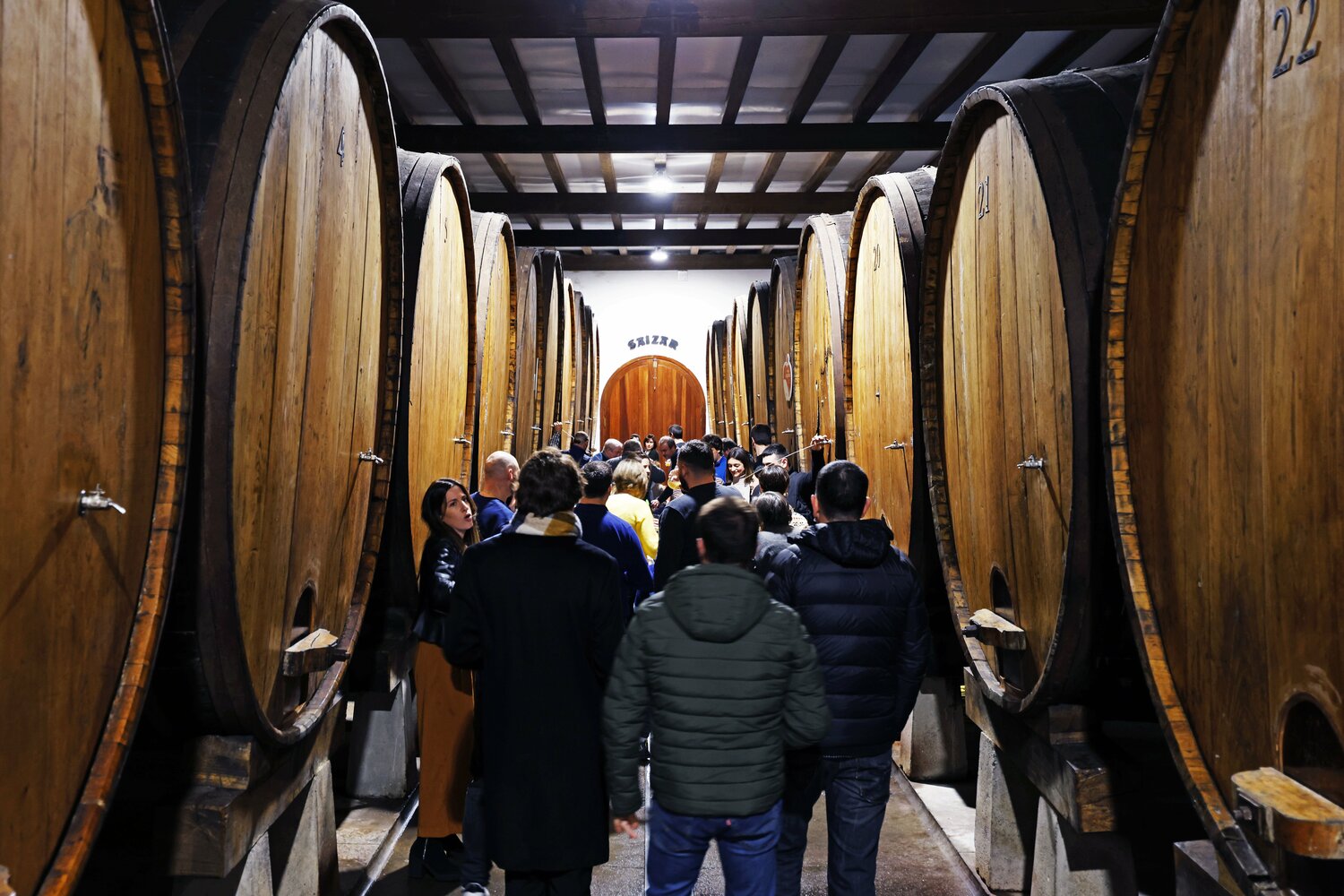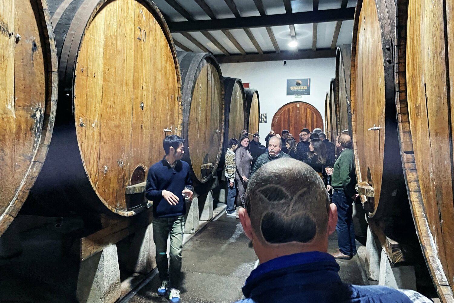 料理は、シードラ飲み放題のコースが一般的。まずシードラで煮詰めたチョリソを一口頬張る。そして食事スペース隣にある、ひんやりとした蔵に向かうと、2メートル超の巨大な樽がたくさん待ち構えていた。