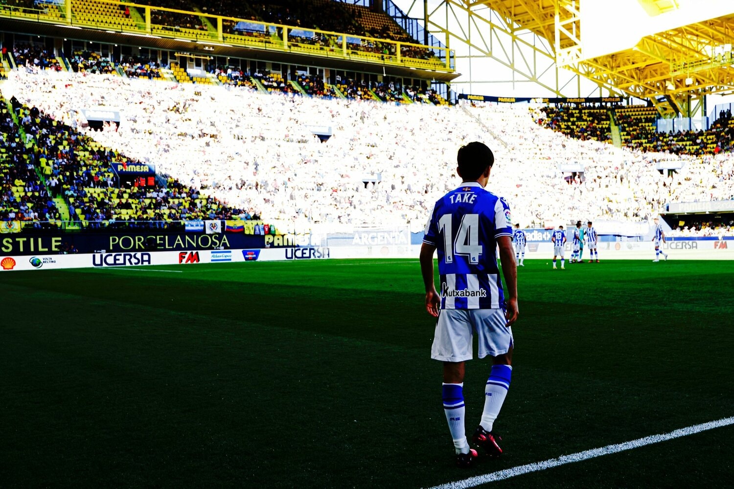 選手入場、集合写真撮影、そしてコイントスにより当初の攻撃エンドが交換された。ソシエダは太陽を背に、陽の当たるサイドへ攻めることを選んだ。特にこの日、右サイドでのプレーが多くなった久保は、前半の多くの時間を日差しの下でプレーすることとなった。