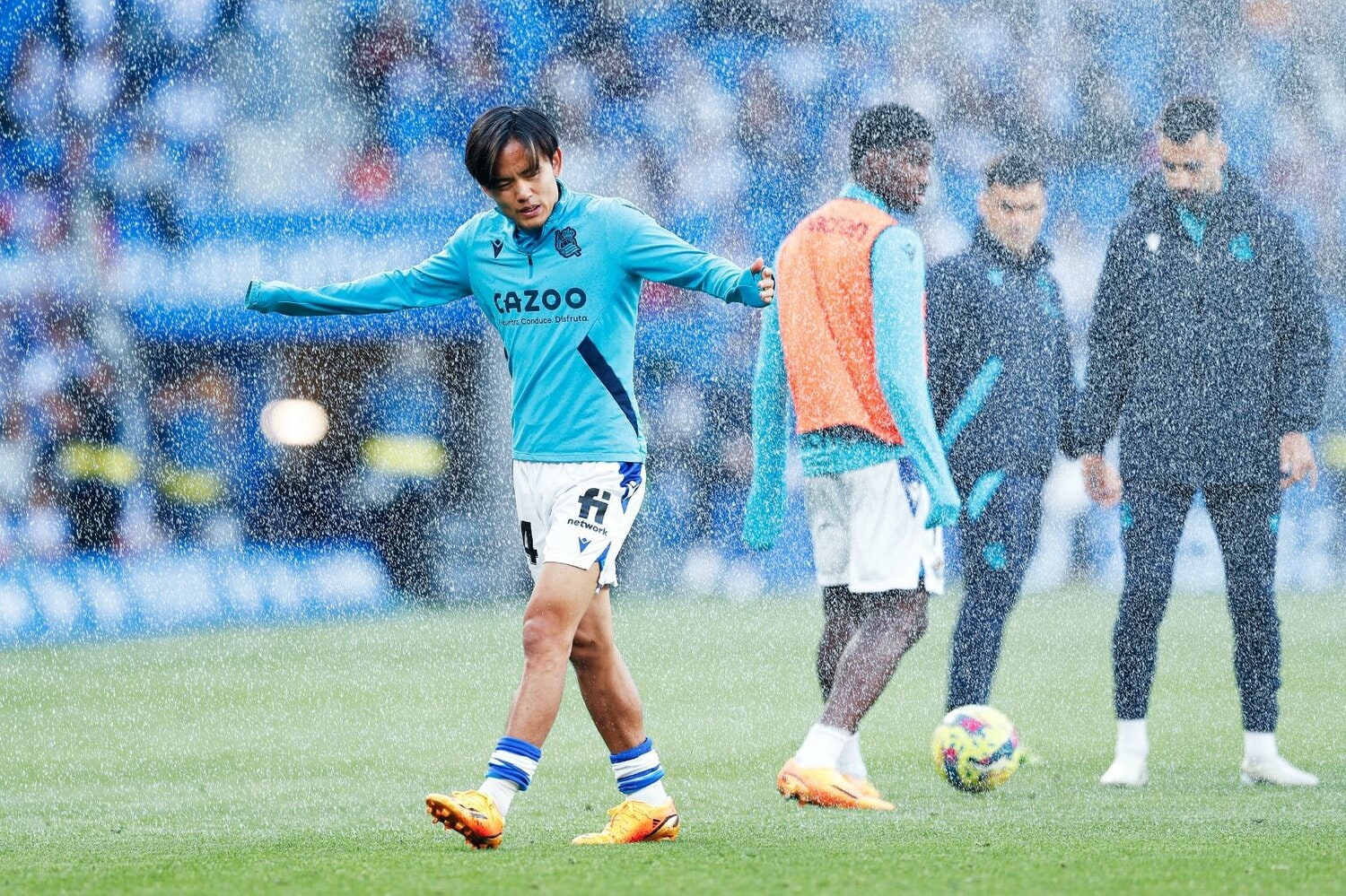 散水直撃の影響は……なかったと思われるが、ソシエダはメンバー交代をしないまま後半がスタートする。再度ピッチ脇に姿を現した久保に、改めてスタンドから久保コールが送られると、久保もそれに感謝を示すように手を合わせた。
