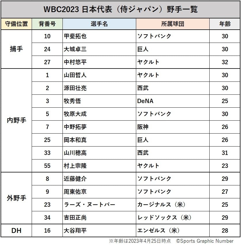投票に添えられたコメントを精査していてあらためて気づかされたのが、惜しくもランクインを逃した野手も、間違いなく“MVP級”の働きをしていた、ということです。記事公開後に読者から届いた反響のなかでも、特に多かったのが「あの選手が入っていないなんて!」という声でした(侍ジャパンの野手一覧は下記リストをご参照ください)。