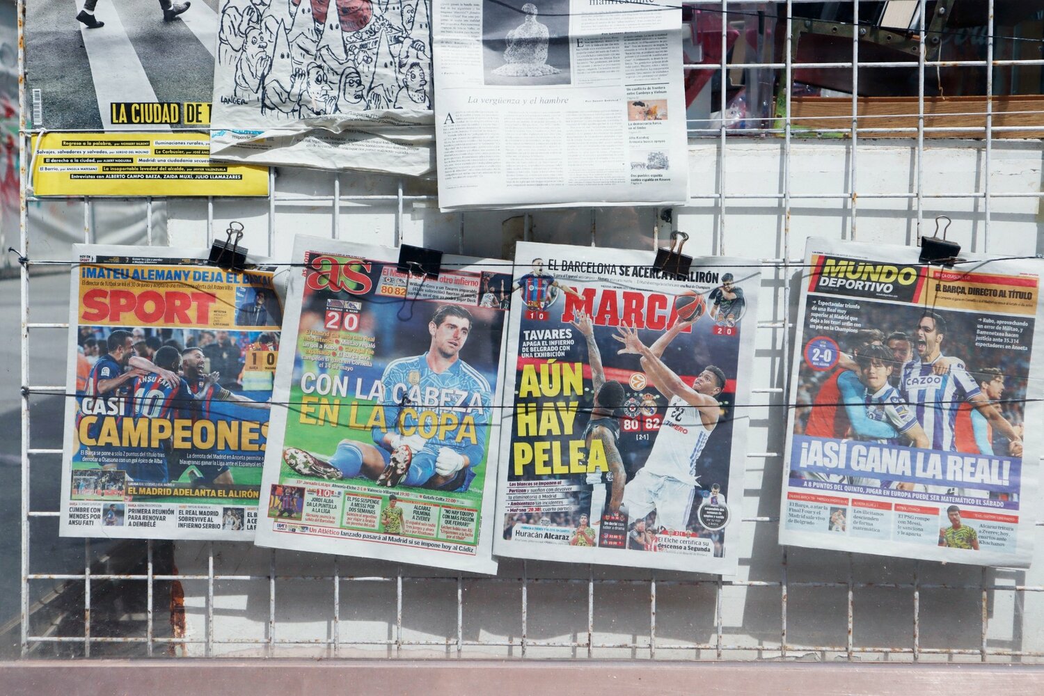 街角の新聞ショップに吊るされたスポーツ紙には、同日開催だった優勝へ近づくバルサの勝利を伝える「SPORT」、マドリーの敗退を伝える「AS」、バスケの速報を伝える「MARCA」に混ざって、「MUNDO」紙の一面を見事に飾る久保の姿があった。