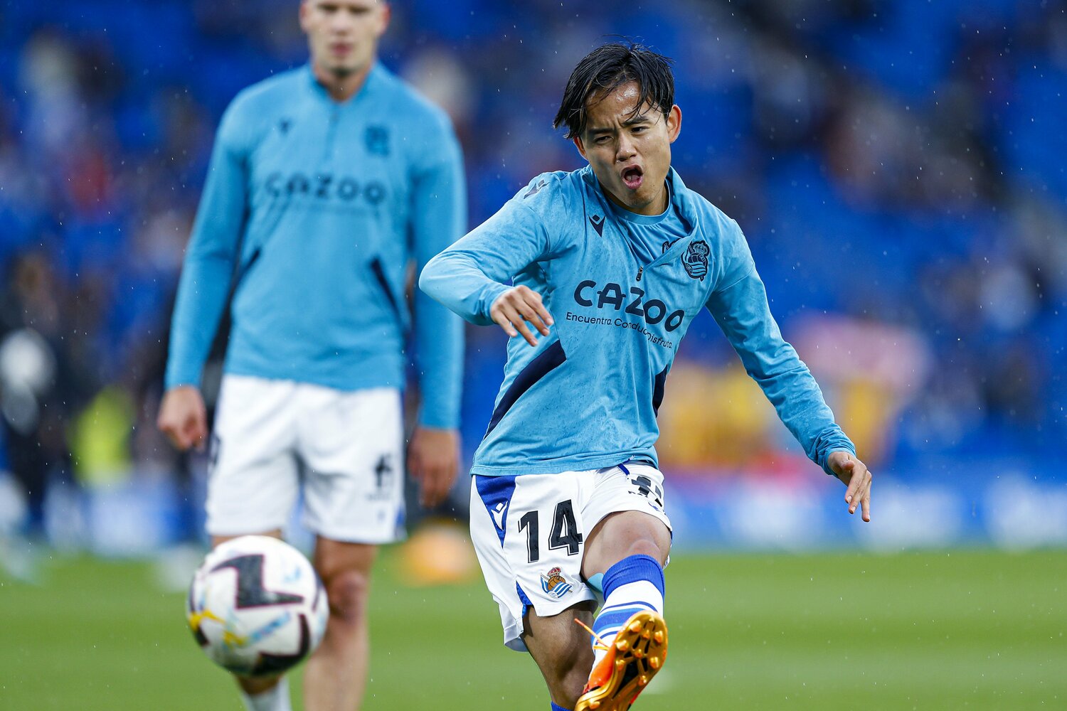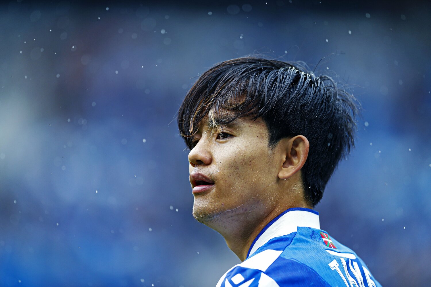 一度は止んでいたが、再び降り出した雨が、ピッチ上で準備を進める選手たちを濡らし始めた。両チーム選手入場と前後するように、最初のピークを迎えた強い雨脚が久保の顔を光らせていた。