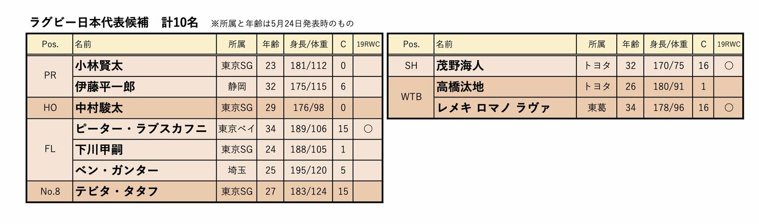 5月24日、9月に開幕するラグビーワールドカップ(W杯)に向けた日本代表スコッドが発表された。今回発表されたのは「日本代表36人」と「日本代表候補10人」のあわせて46人。