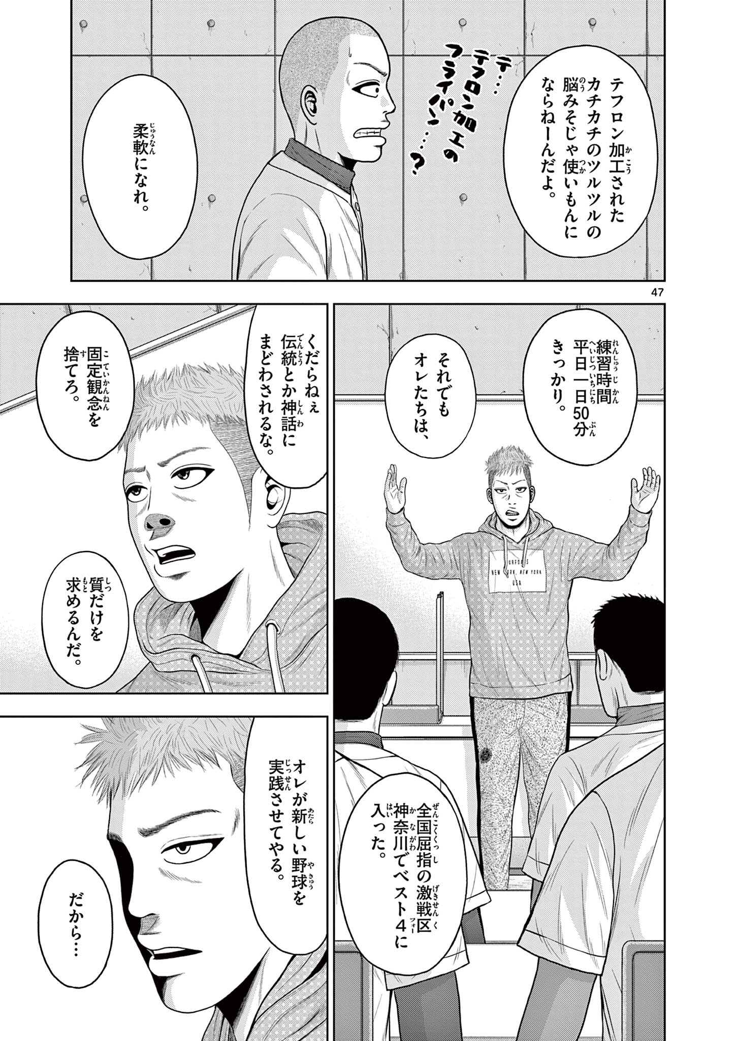 練習は1日50分、月曜日は完全休養、部員は全員元投手……それでも神奈川県でベスト4に進出。そんな「普通の高校野球」とは一線を画す同校の目指すスタイルは”超合理的野球”だ。型破りな監督が率いる野球部が見せる活躍と、時折の苦悩を描いたコミック『ベー革』(小学館)1巻より第1話をお届けする。