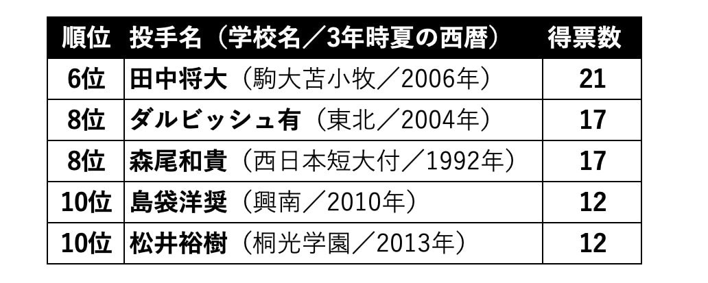 21票を集めた田中将大(駒大苫小牧/南北海道)が6位にランクイン。